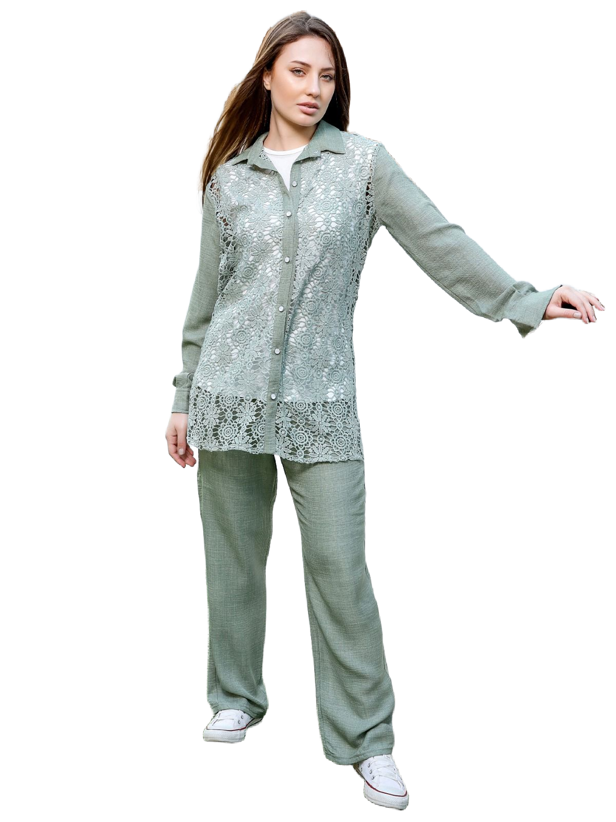 يتكون من بلوزة وبنطلون بتنسيق مرتب يسهل عليك اللبس كل يوم