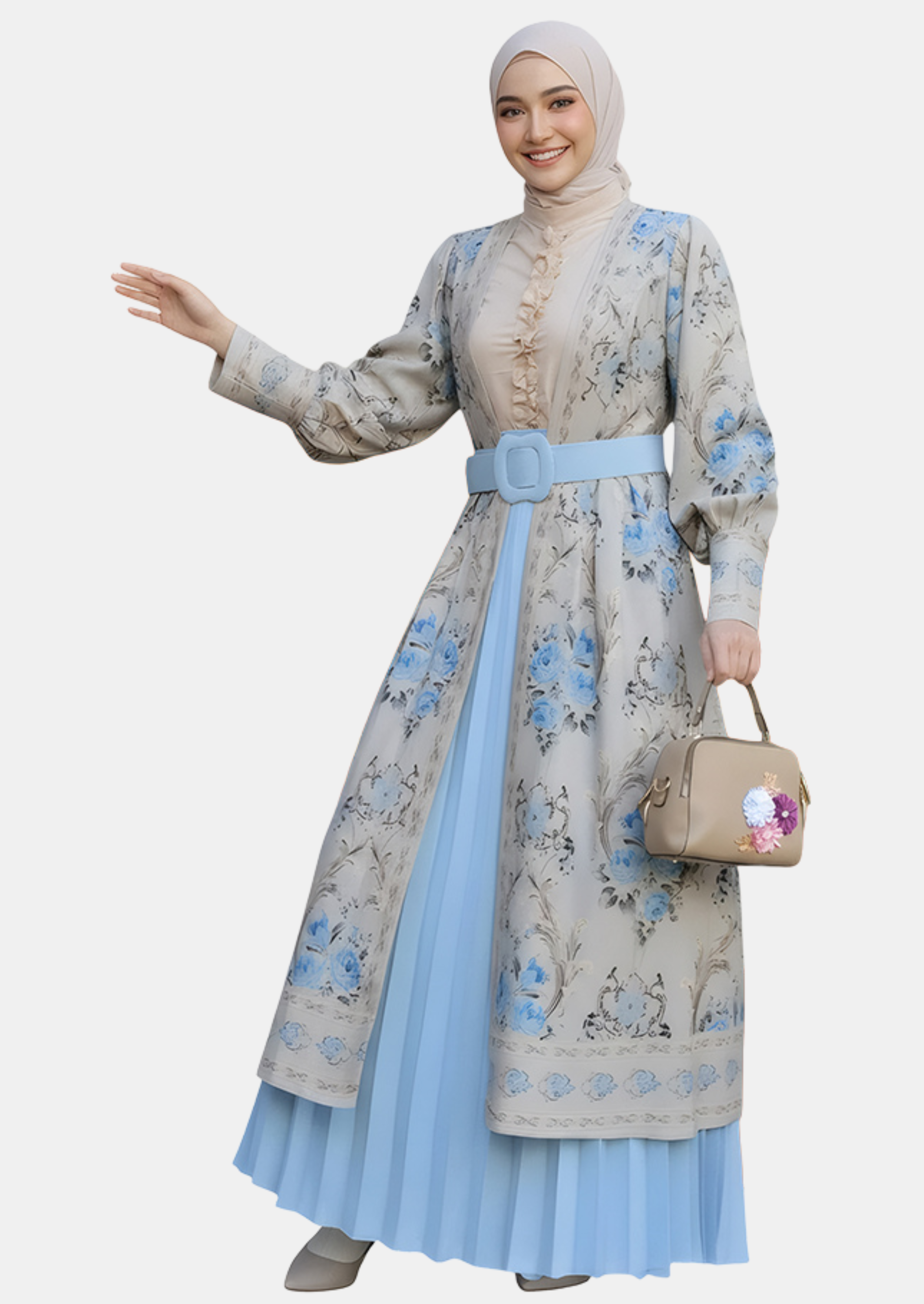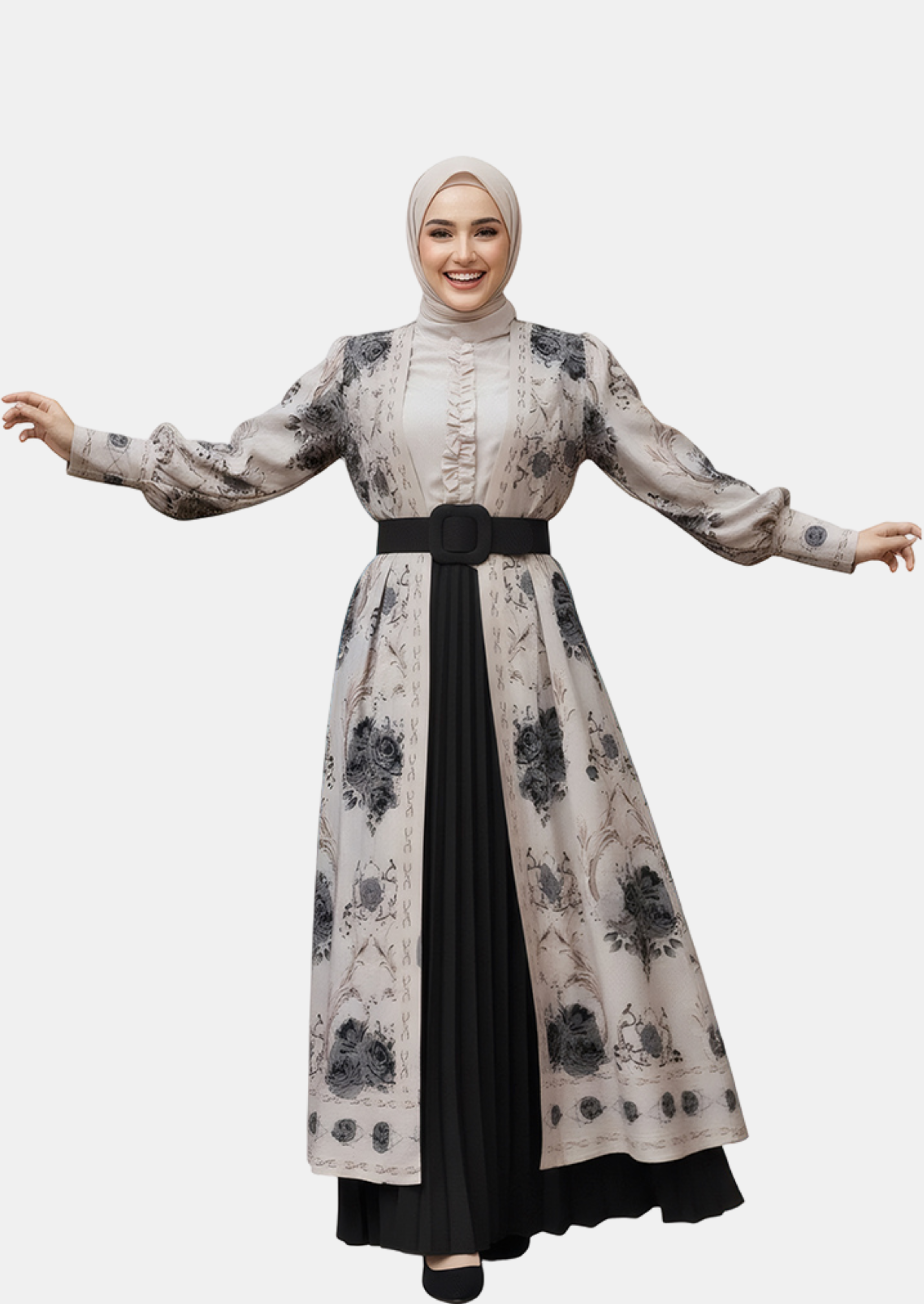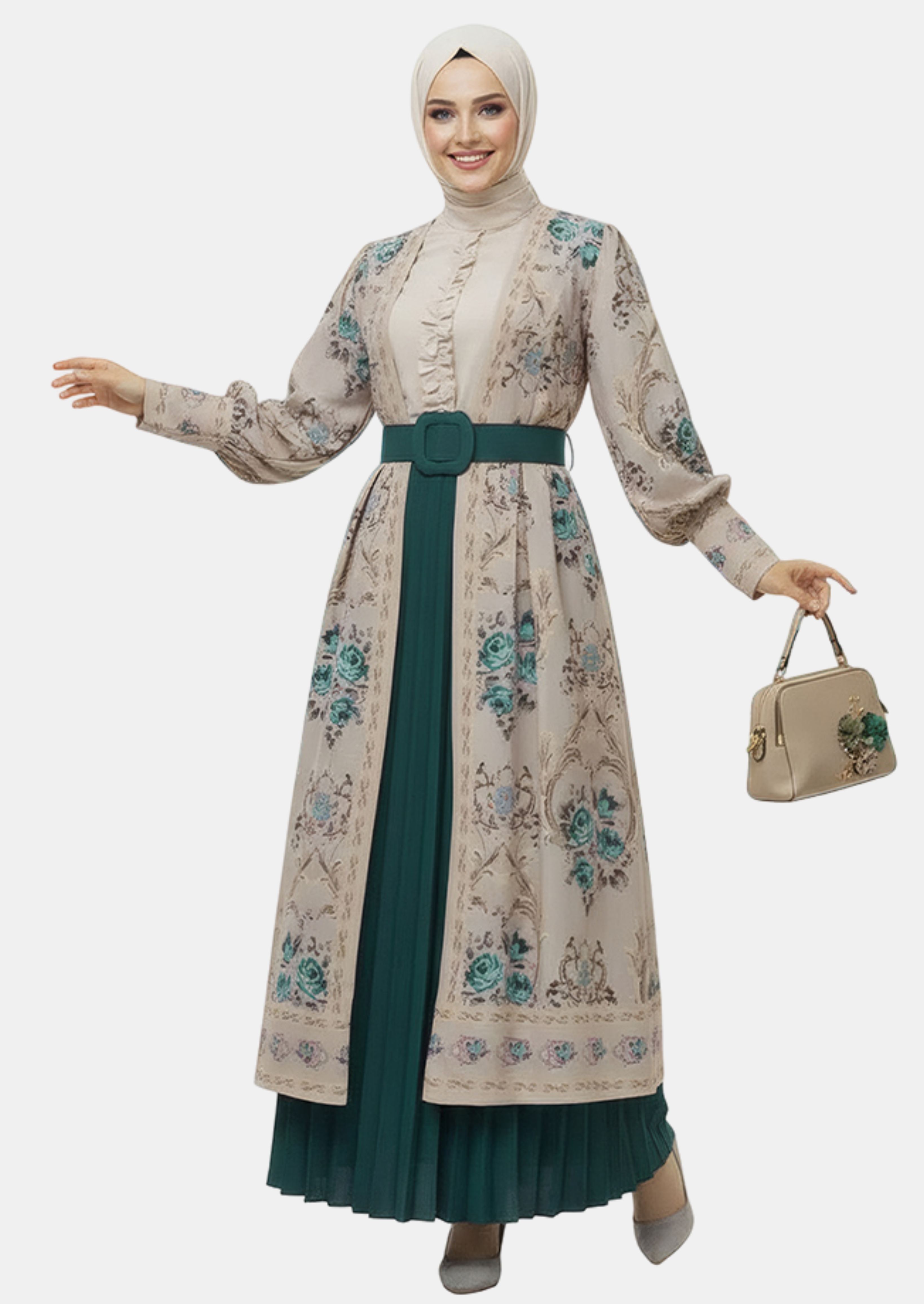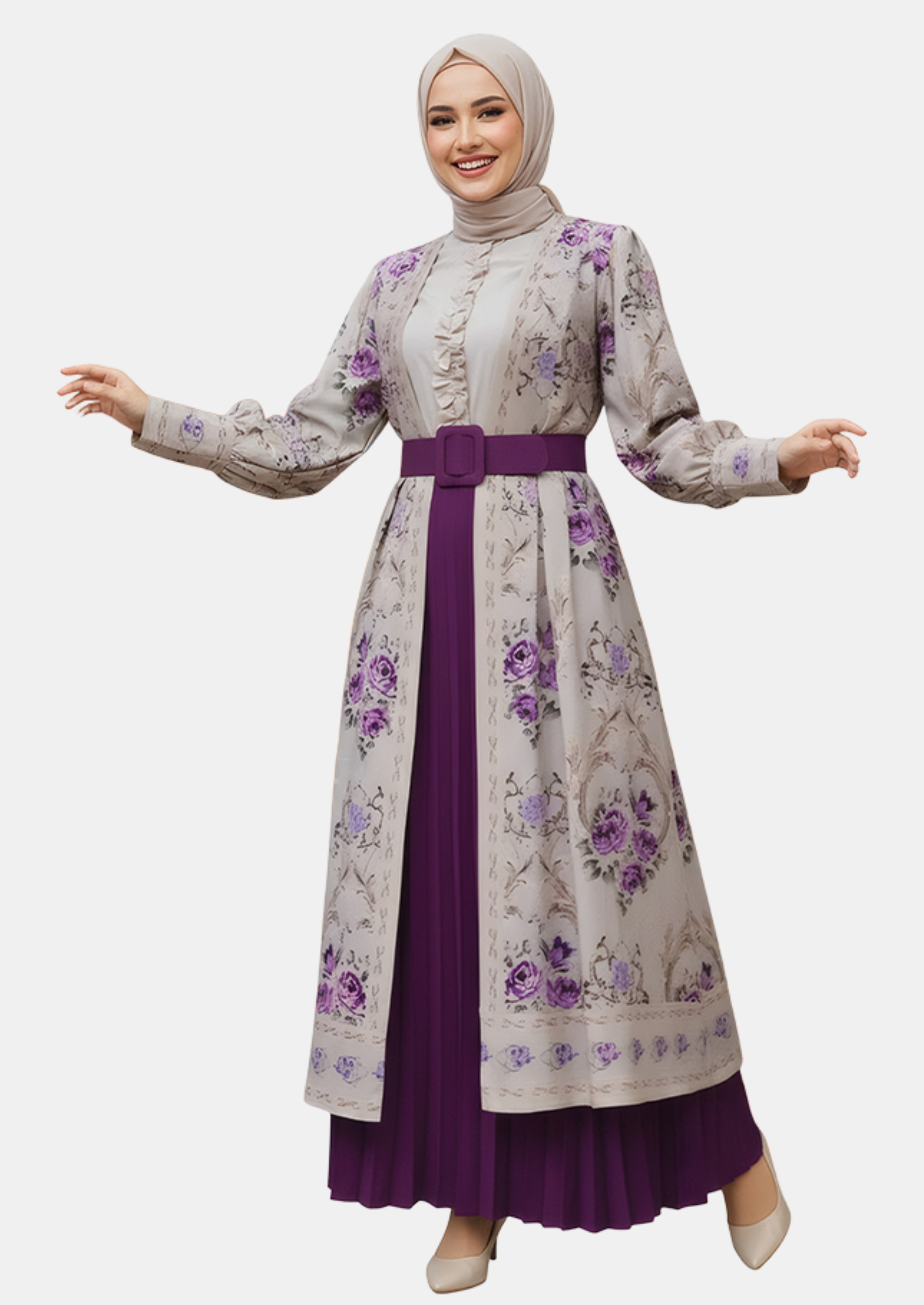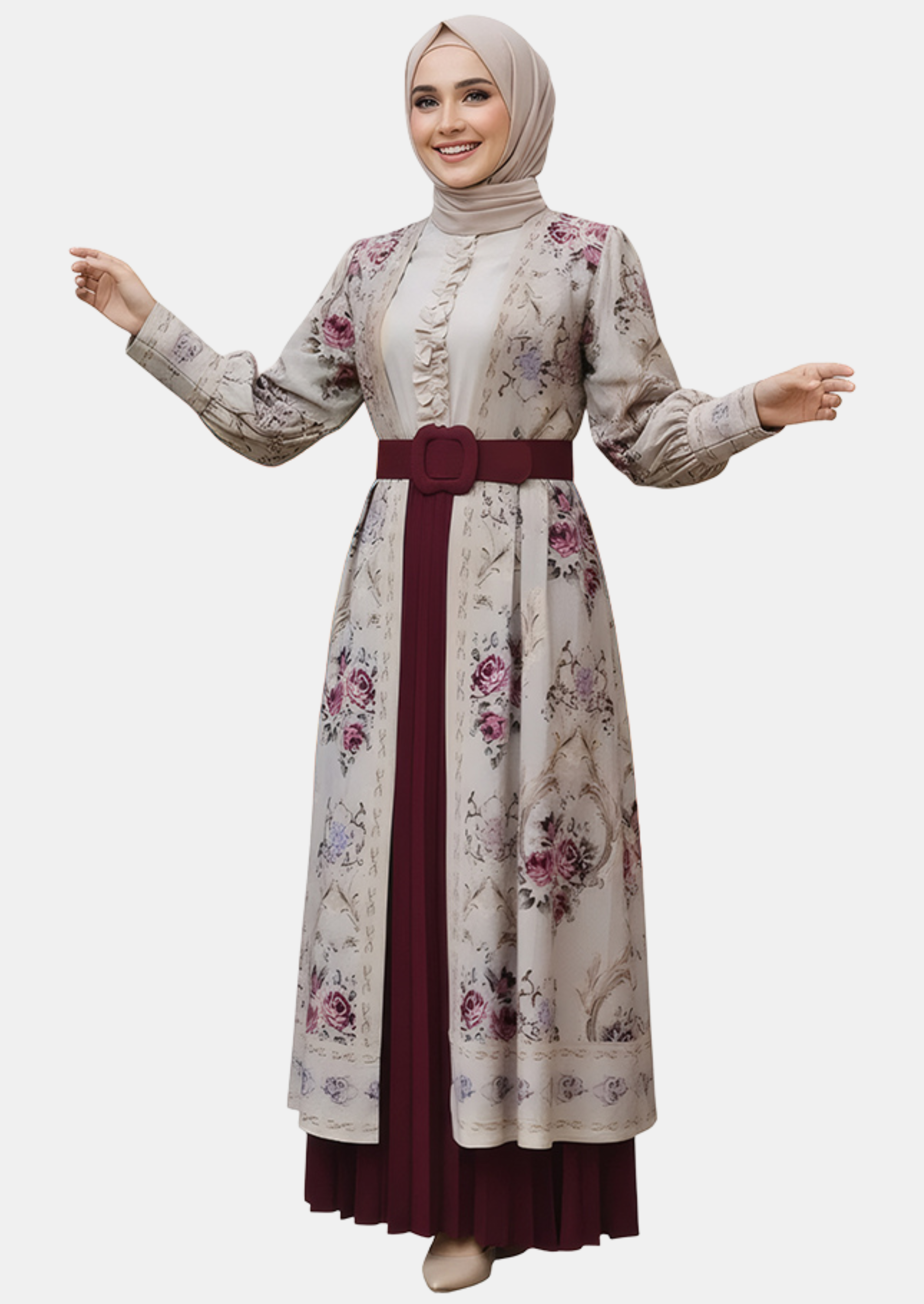 مكون من 3 قطع تكملك: فستان، عباية خفيفة، فستان سادة، حزام، تفصيل واسع، ألوان هادية، خامة مريحة ومرتبة ، مناسبة للمناسبات والطلعات المهمة